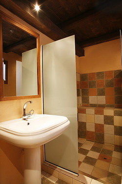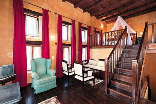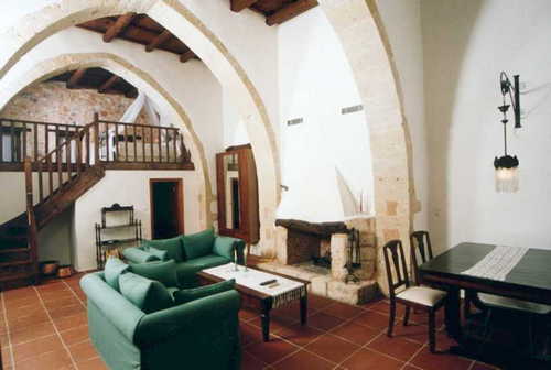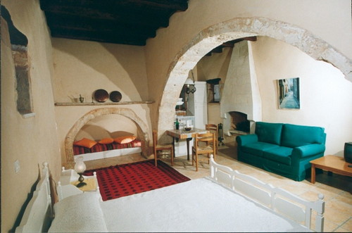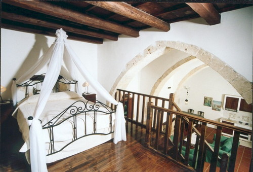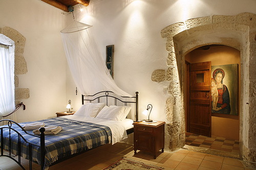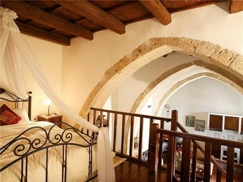 Roberto Villa is a stone built property listed in the historical home registry in Greece. The property was renovated in 2001 and in 2010 further changes were made. The main entrance to Roberto Villa is located within a private, inner courtyard tiled with stone slabs. The pool area is also accessed from the courtyard. The living area is the original wine cellar of the house. Arches 6 meters high and a fireplace provide the background for a comfortable seating area with two sofas, several chairs and a writing desk. The loft above the living area has two single beds and a wardrobe. A full bath with tub is situated below the loft. The kitchen at Roberto Villa is fully fitted and has a large dining table. A full fridge-freezer, microwave, kettle, toaster and cook-ware complete the kitchen. There is a small W/C just off the kitchen area. One of the two bedroom suites is located above the kitchen area. The bedroom area is at the top of a three story building. There are stairs leading to the bathroom on the mezzanine level and up to the seating area and then up to the bedroom loft. This part of the building was originally the harem |