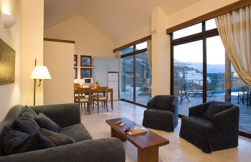 Jean Villa consists of four bedrooms, a well-appointed living room and kitchen area. The main characteristic of this villa is its L-shape with windows all around and its two extremely spacious stone flagged terraces (160 s.m.) providing a stunning bay view. The complex is just 100m from the renowned beach of Istron Bay Hotel which has been honoured with the prestigious blue-flag award for 18 years in a row. The whole villa is tiled with magnificent Volos pink marble creating a sense of luxury. The spacious living room combines a sitting area with a dining area and a fully equipped kitchen. It has comfortable sitting furniture; |