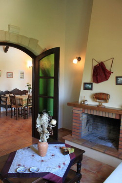 The villa has a fully equipped kitchen with a large refrigerator, oven and hob, and a variety of small electrical appliances such as a toaster, coffee machine, kettle, food mixer and juice machine. The kitchen area is connected by a large arched doorway leading to a very comfortable living room. Each living room has 2 sofas which convert into beds, a television and a fireplace. The bedroom in each villa has a double bed, wardrobes, a balcony and a beautiful bathroom with bath. The washing machine is also sited here. The villa is equipped with air-conditioning, providing cool temperatures during the warm summers and heating during the winter season.