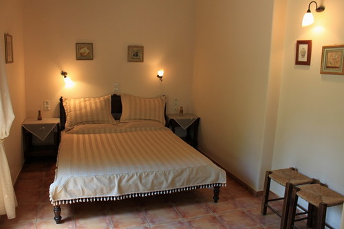 The villa is 70 sqm and is built on an area of 4 acres. Paths paved with local stone connect the complex of villas, in keeping the rural surroundings. The villa has a fully equipped kitchen with a large refrigerator, oven and hob, and a variety of small electrical appliances such as a toaster, coffee machine, kettle, food mixer and juice machine. The kitchen area is connected by a large arched doorway leading to a very comfortable living room. Each living room has 2 sofas which convert into beds, a television and a fireplace. The bedroom in each villa has a double bed, wardrobes, a balcony and a beautiful bathroom with bath. The washing machine is also sited here. The villa is equipped with air-conditioning, providing cool temperatures during the warm summers and heating during the winter season. From the pool area fabulous panoramic views of the countryside and nearby Georgioupolis can be enjoyed. |