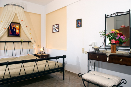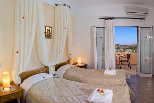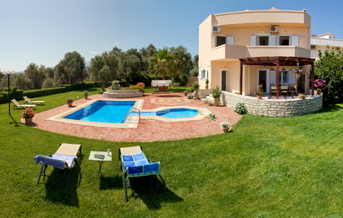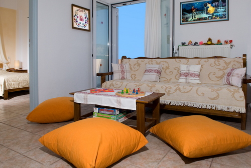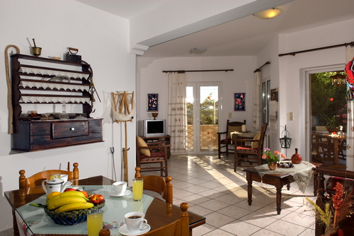 Makena Villa is a semi detached split - level house of 120 square meters and it has the possibility of accommodating up to 6 individuals using the 2 couches as a bed. There are three bedrooms upstairs including the baby room and an equipped bathroom and a veranda with immense view. The ground floor is a big space including living room, dining room, a completely equipped kitchen with oven, refrigerator, kettle, coffee-maker, juice maker, toaster etc as well as a WC with shower, and a big veranda. It is located on the top of a green hill, where only the chirping of birds can disturb the silence. The villa is 800m away from the village of Perama which can be found in the middle of the island of Creta in the county of Rethimnon. It is surrounded by a marvellous garden 2.000 square meters, appropriate for people who love peace and nature with a lot of varieties of flowers and trees. The swimming pool in the middle of the garden, is surrounded by 600m2 of grass is ideal for relaxation and games in water, as it also has water massage. |