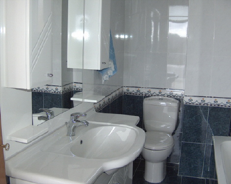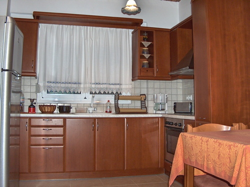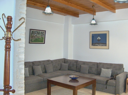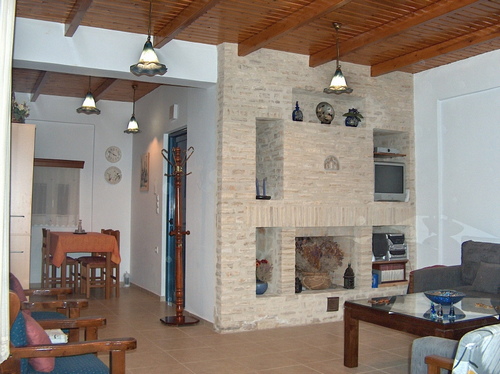 Marble stairs lead to a large veranda. On the ground floor theres a fully equipped kitchen/dining room, a sunny double bedroom and a shower/WC with a washing machine. The spacious living area comes with a built-in stone fireplace, a huge L-shaped sofa, satellite TV and stereo system. A wooden staircase leads to the three double bedrooms the bathroom and the two verandas of the second floor. All bedrooms have air-condition (free of charge). The floors are tiled and the ceilings covered in wood.