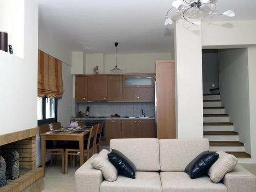 The villa is 112 sqm in size consisted of two storeys and can accommodate up to 6 people. Entering the house on the ground floor there is a spacious living and dining room , with fireplace, satellite TV, DVD player, stereo Hi-Fi, air-condition, modern furniture and lights. Next to the living room is an open plan fully equipped kitchen. Further on there is a bedroom with iron-bed air condition, sat. TV, a bathroom (bath-wc) and a storage room where are the washing machine and the ironing board.