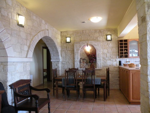 Next to the swimming pool, at a higher level, there is the space for the barbecue and the traditional oven burning wood. This space can alternatively be used as a second dining room - living room, during the day as there is a pergola made from logs of cypress tree and reeds, offering the required shade to the resident.